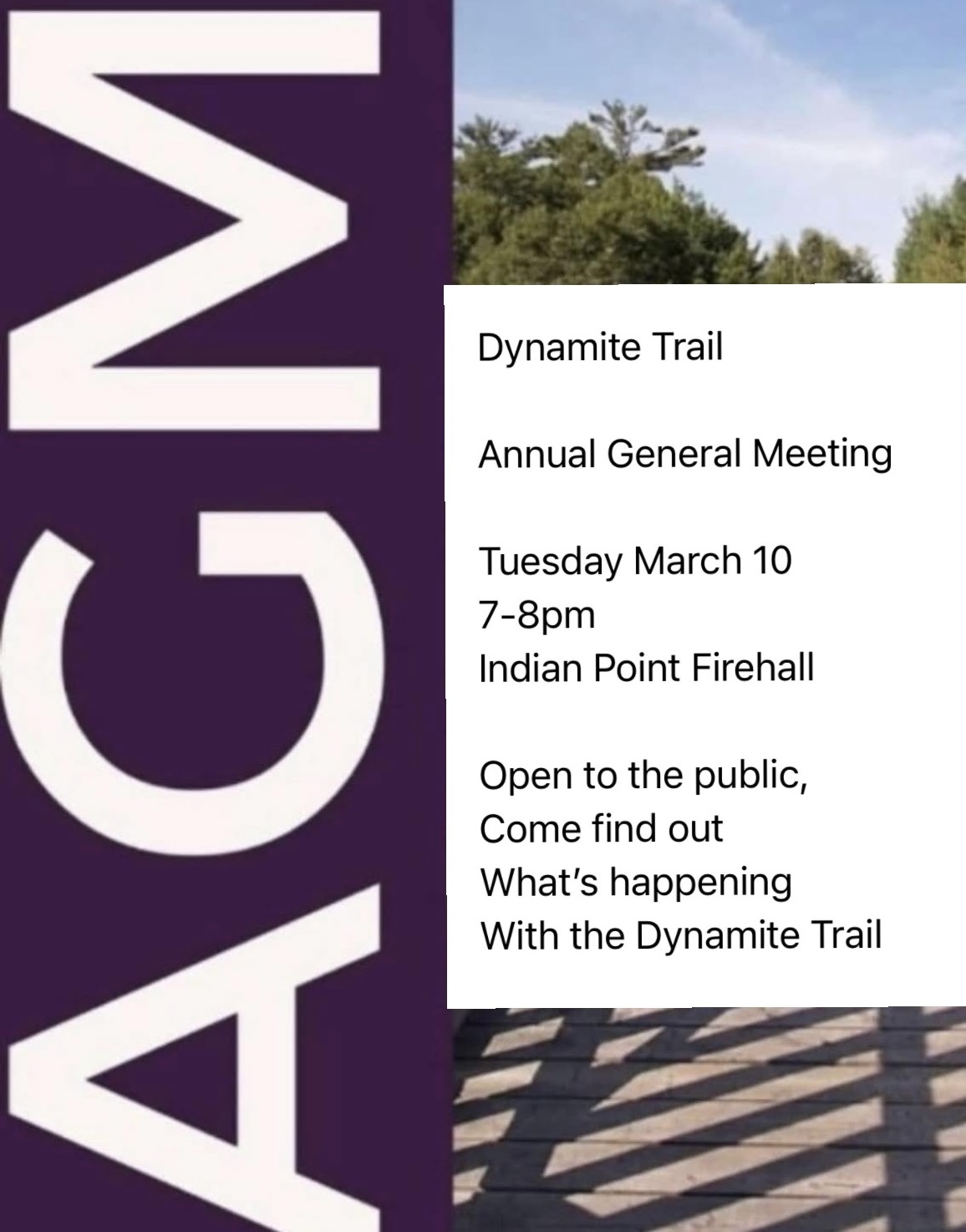 Our Annual General Meeting (AGM) will be held on Tuesday March 10 at the Indian point Firehall. The meeting will be open to the public.